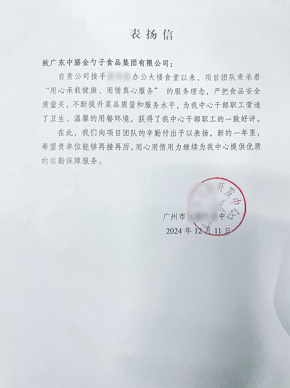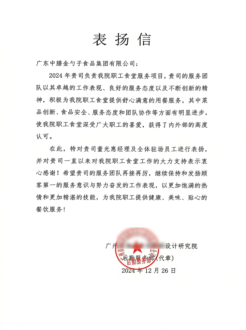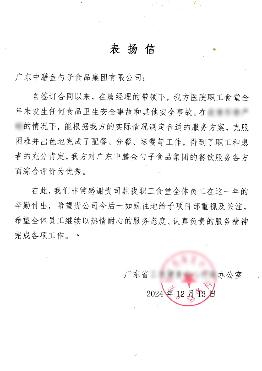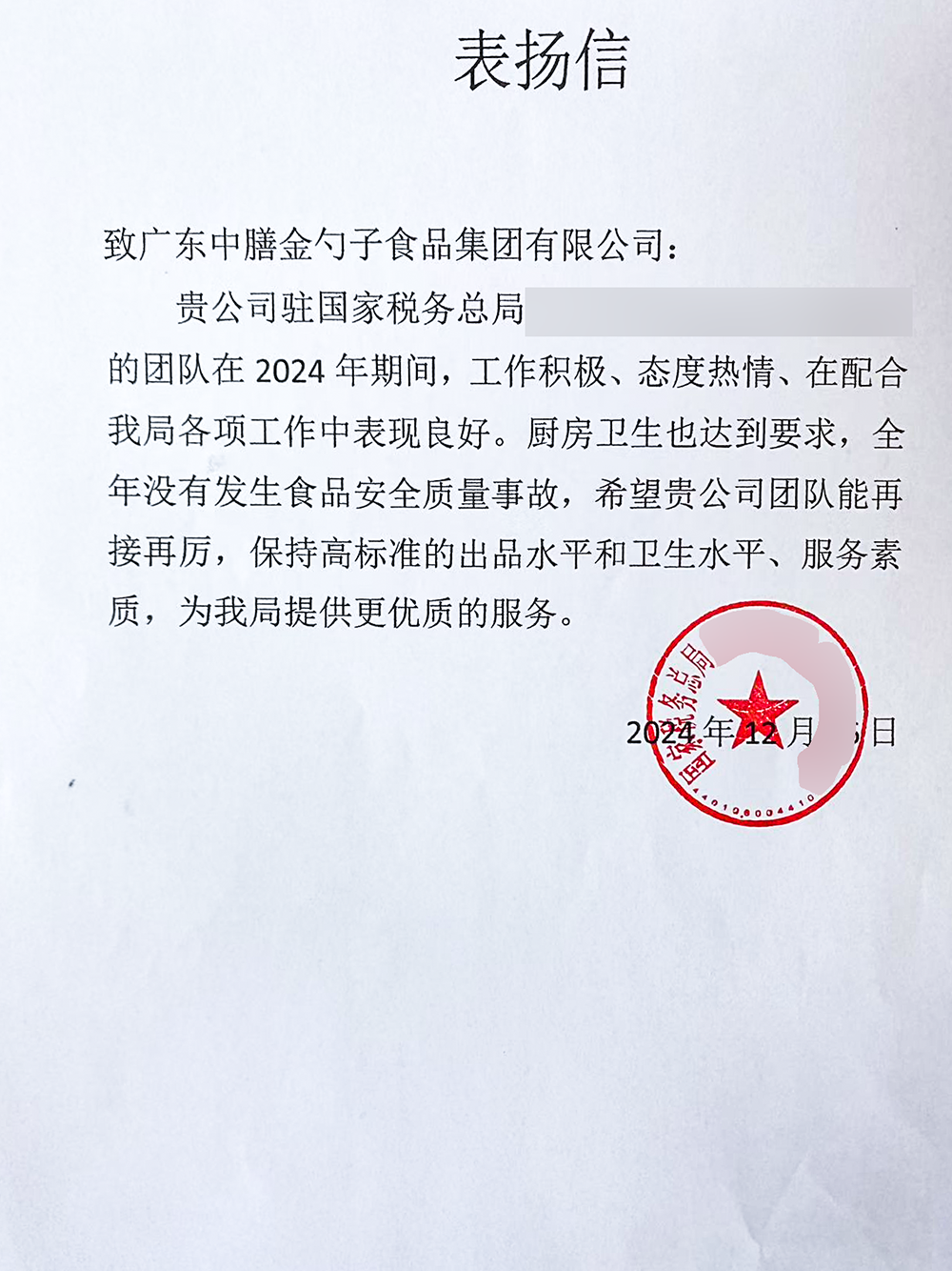 4、2024年3月,金勺子團餐337門店獲泉州市市場監督管理局贊譽,食安管理成為地區示范標準。