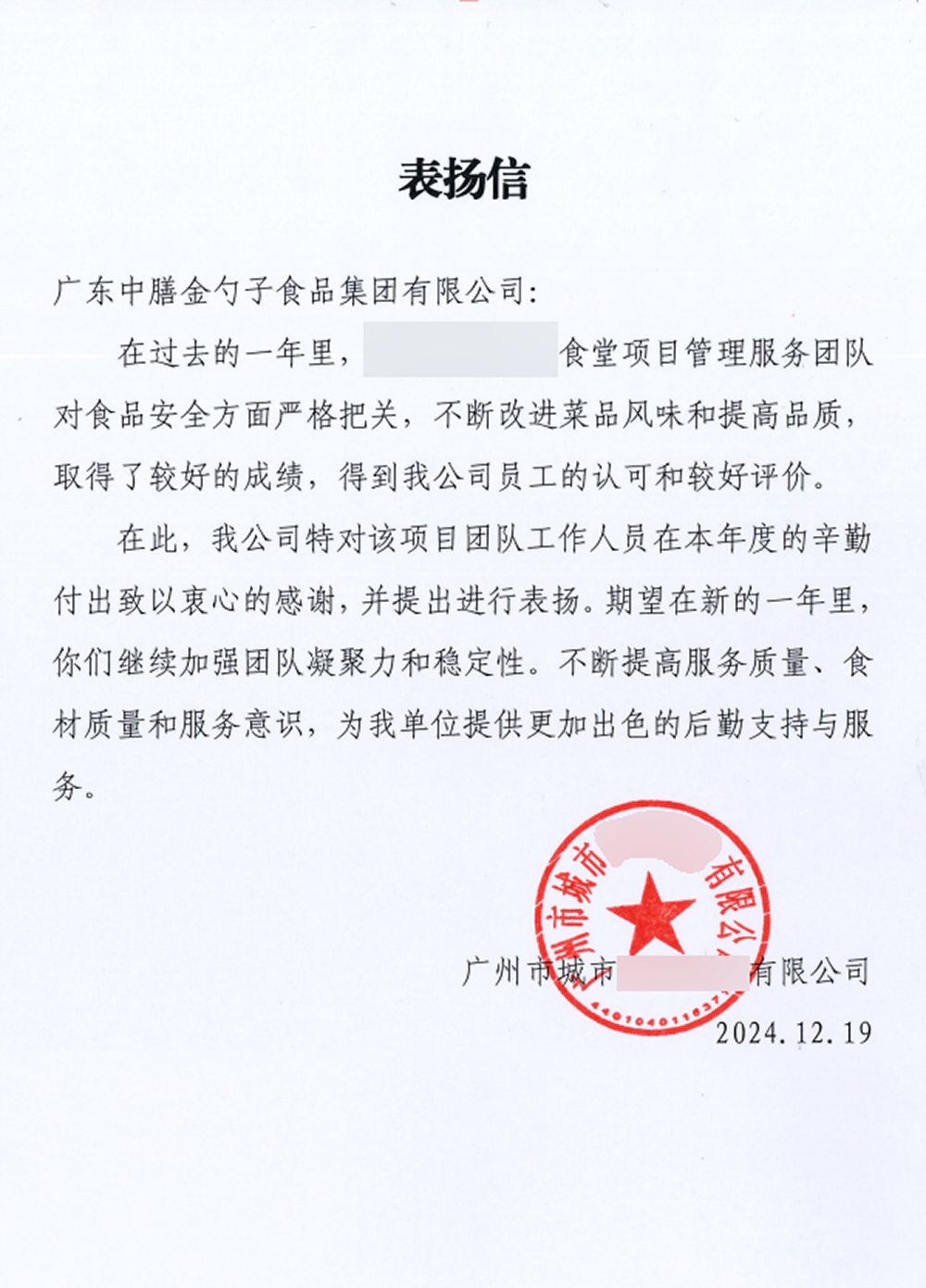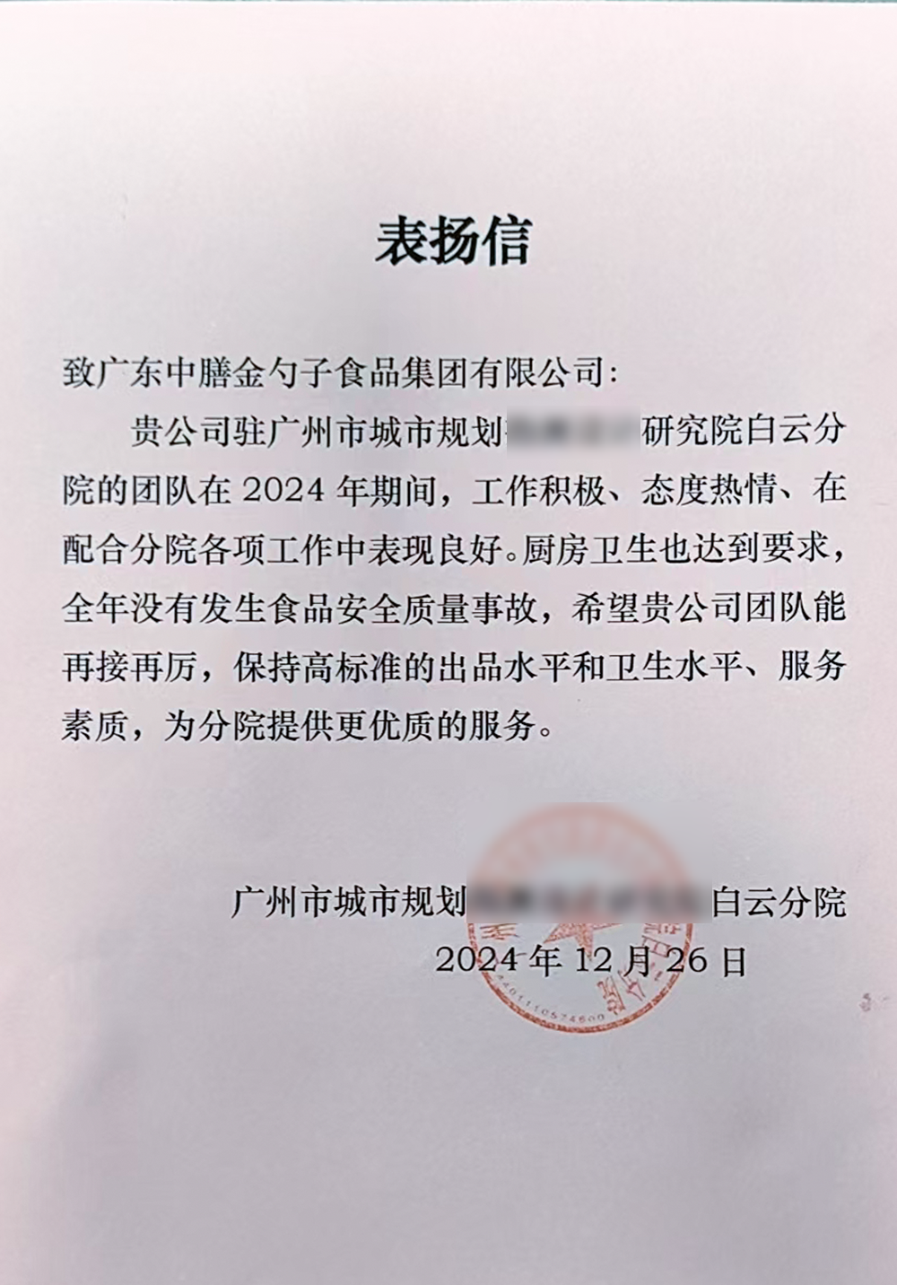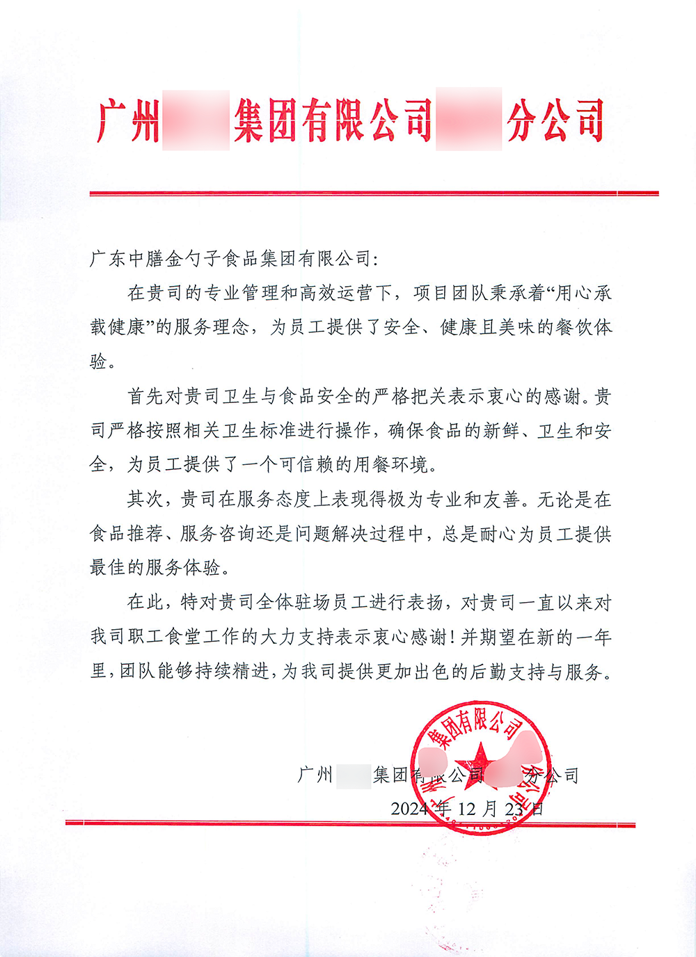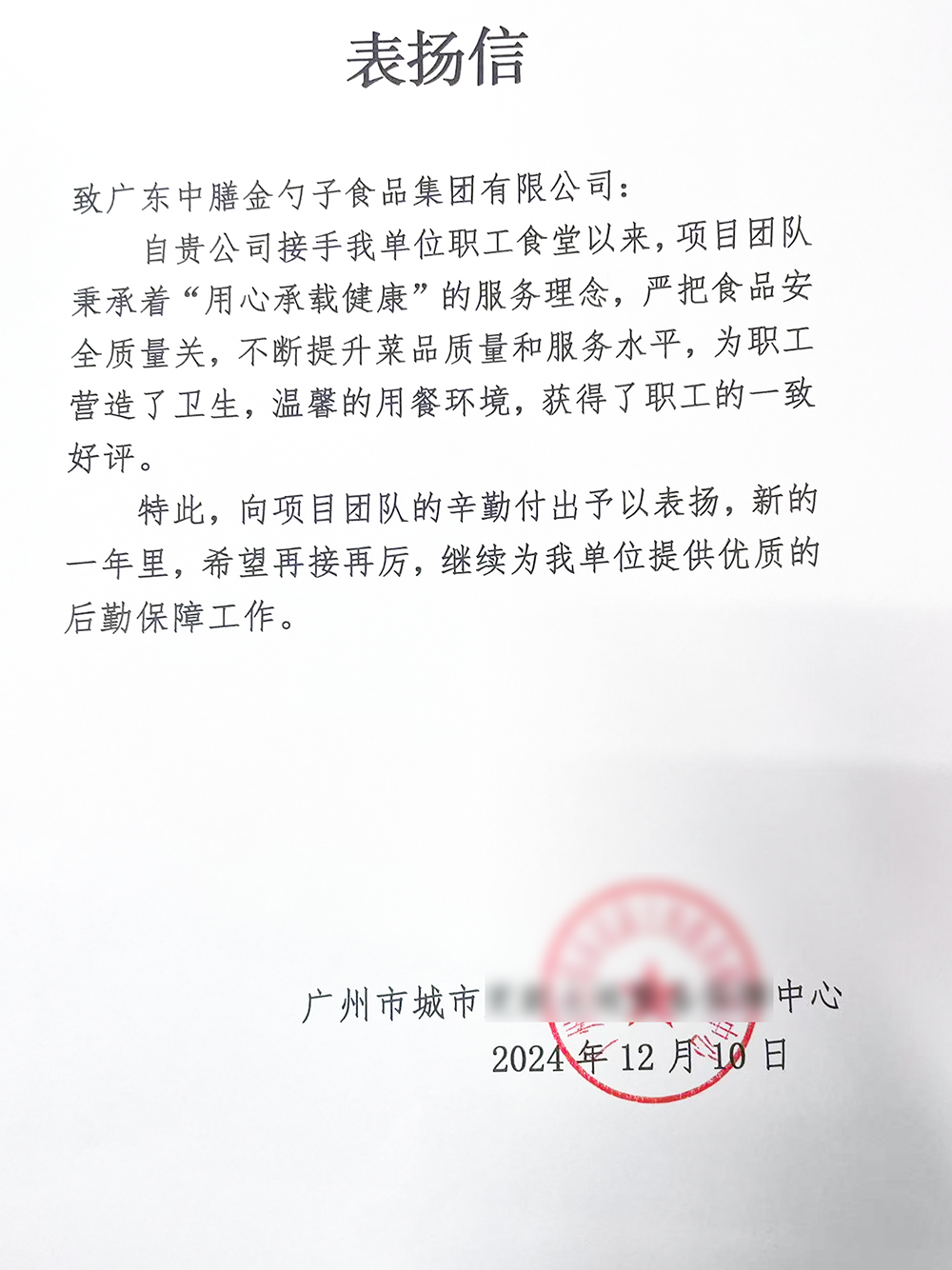 4、2024年3月,金勺子團餐337門店獲泉州市市場監督管理局贊譽,食安管理成為地區示范標準。