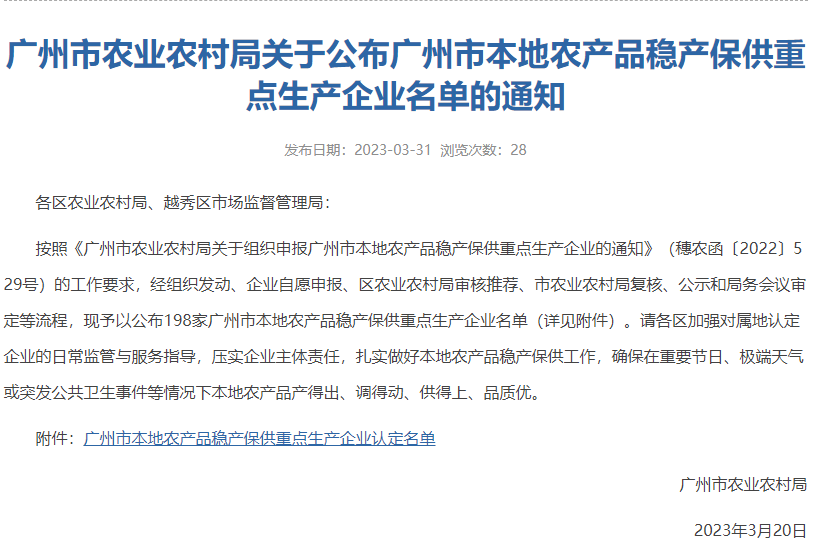 為高效開(kāi)展本地農(nóng)產(chǎn)品生產(chǎn)調(diào)度,建立健全本地農(nóng)產(chǎn)品穩(wěn)產(chǎn)保供長(zhǎng)效機(jī)制,廣州市農(nóng)業(yè)農(nóng)村局開(kāi)展了新一輪的農(nóng)產(chǎn)品穩(wěn)產(chǎn)保供重點(diǎn)生產(chǎn)企業(yè)申報(bào)工作,遴選一批社會(huì)責(zé)任感強(qiáng)、生產(chǎn)規(guī)模較大的優(yōu)質(zhì)農(nóng)產(chǎn)品生產(chǎn)企業(yè)作為廣州市農(nóng)產(chǎn)品穩(wěn)產(chǎn)保供重點(diǎn)生產(chǎn)企業(yè)。