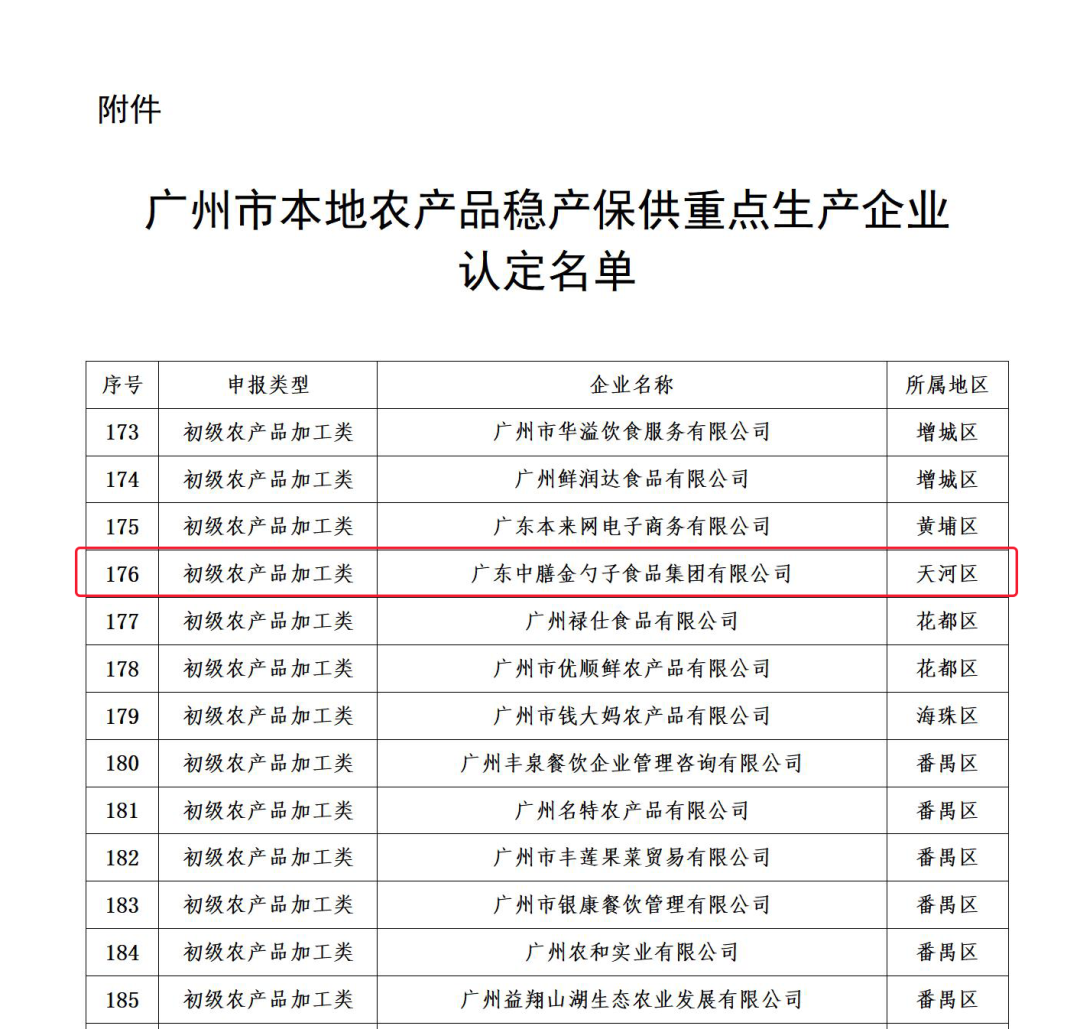 2023年3月31日,廣州市農(nóng)業(yè)農(nóng)村局在官網(wǎng)公布了一批農(nóng)產(chǎn)品穩(wěn)產(chǎn)保供重點(diǎn)生產(chǎn)企業(yè)名單(共198家),其中“廣東中膳金勺子食品集團(tuán)有限公司”被認(rèn)定為“初級(jí)農(nóng)產(chǎn)品加工類(lèi)”穩(wěn)產(chǎn)保供重點(diǎn)生產(chǎn)企業(yè)。