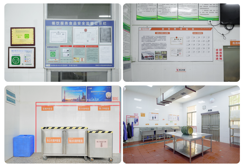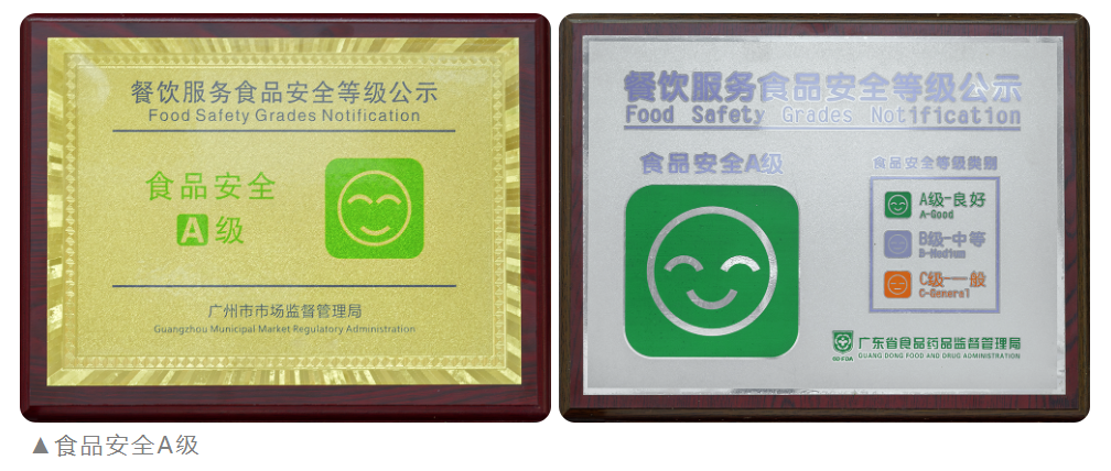 經裝修升級后,金勺子餐飲項目704門店環境舒適優美、食品留樣食品檢測、后廚標識清晰、工具擺放到位、臺賬上墻、記錄在冊等,整體服務及食品安全管理水平較高,先后被廣東省食品藥品監督管理局和廣州市市場監督管理局授予“食品安全A級”榮譽。