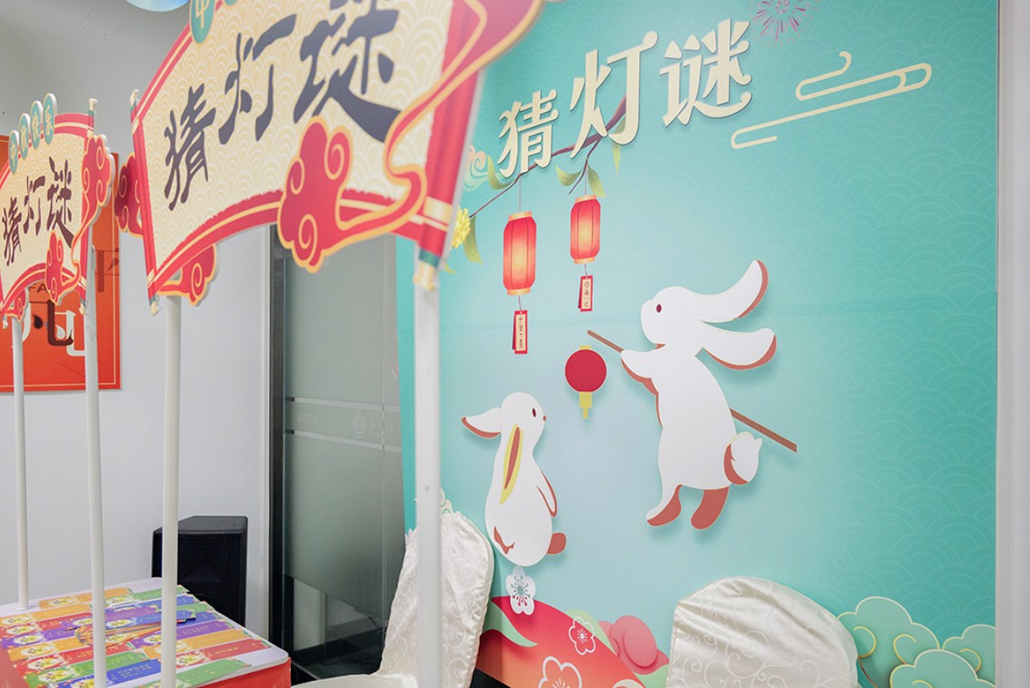 《猜燈謎》如火如荼地進行著,員工們圍繞著燈謎互相討論,氛圍活躍。